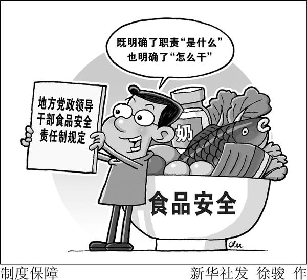 近日印发的《地方党政领导干部食品安全责任制规定》,对地方党政领导干部食品安全职责、考核监督、奖惩等作出了明确规定。国家市场监管总局有关负责人表示,这是第一部关于地方党政领导干部食品安全责任的党内法规,为保障食品安全提供了长效机制。