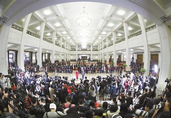 3月3日,中国人民政治协商会议第十三届全国委员会第二次会议在北京人民大会堂开幕。这是全国政协委员吴伟仁(右)、陈冯富珍在“委员通道”接受采访。新华社记者 沈伯韩 摄