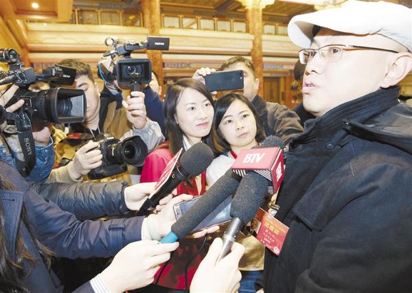 3月3日,北京代表团的全国人大代表戴天方在北京会议中心签到后接受采访。新华社记者 金立旺 摄