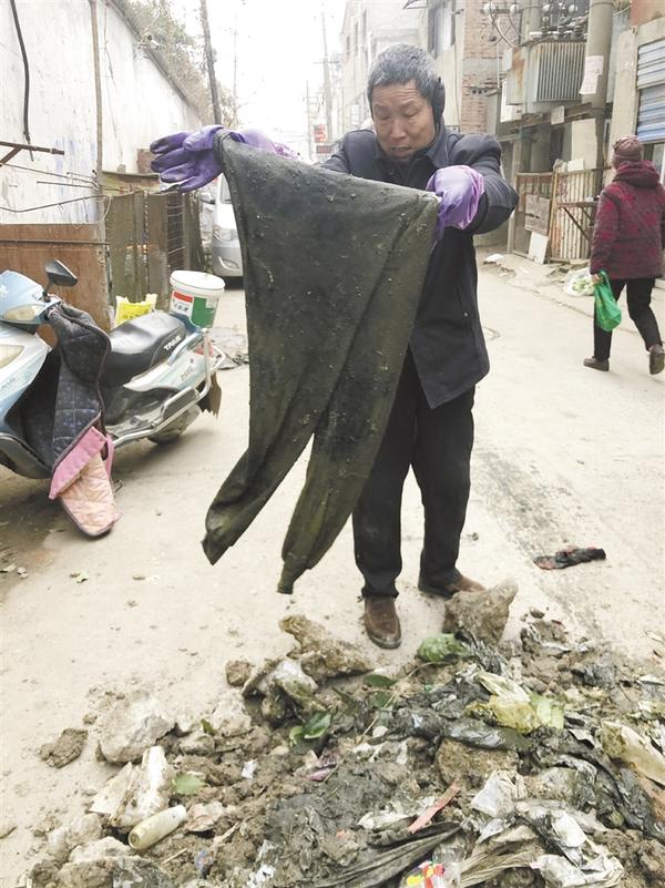3月1日,记者在现场看到,4名工人在水坑东边的路上分别挖了两个洞,用粗铁丝等工具进行清淤,掏出了裤子、淤泥、碎石,还有很多塑料袋。一名工人告诉记者,有人往公厕里扔塑料袋和裤子,造成了下水道堵塞。