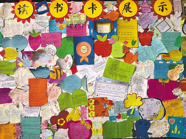 该校从各班收集上来的读书卡中挑选出百余张进行展示。该校学生把自己喜欢的书目名称、作者、内容简介、好词佳句和阅读感想等工工整整地记录在精心设计的卡片上,一张张外观精美、内容丰富的读书卡让读书变得有深度。普普通通的卡片在学生手中神奇地变了身,有的变成了花朵、有的变成了树叶、有的变成了鱼……读书卡形态各异、创意无限、充满童趣,并展示着学生的阅读收获。