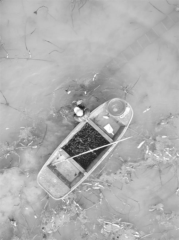3月4日,江苏省淮安市洪泽区东双沟镇养殖户在采收小龙虾(无人机拍摄)。