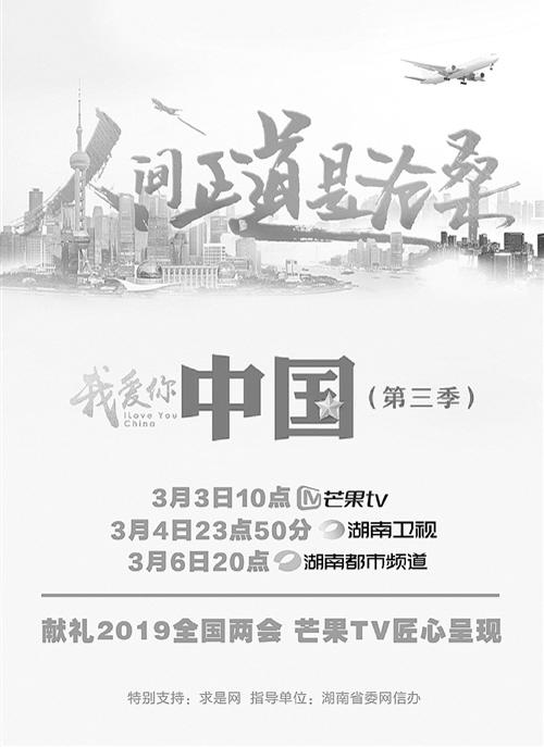 本报综合消息 新时代主旋律大片《我爱你,中国》第三季《人间正道是沧桑》于3月3日起,每日上午10点先在芒果TV全网独播,随后分别于3月4日、3月6日起登陆湖南卫视、湖南都市电视荧屏。节目聚焦7位为伟大复兴中国梦不懈努力的新时代奋斗者,展现出他们的攻坚精神。节目在2019全国两会期间播出,同时更是在中华人民共和国成立70周年之际对时代奋斗者们的礼赞。