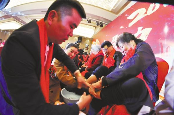 3月12日下午,周口市万明传祺汽车销售有限公司和花千代餐饮有限公司共同举办2018年“齐聚力 共追梦”工作年会。两家公司将员工的父母请到了年会现场,多才多艺的员工献歌献舞的同时,还为父母洗脚,以尽孝心。此活动既增进了员工与父母的感情,也凝聚了企业向心力。记者 梁照曾 摄