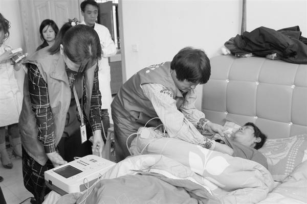 在王岗家中,该院医生先后为王岗父母、妻子进行了彩超、心电图、血压测量、血糖测量等项目检查,并分析、研判病情。