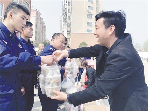 本报讯 4月8日上午,王留长餐饮公司员工为川汇区消防救援大队送来矿泉水、方便面、火腿肠和热腾腾的小笼包,表达对消防队员的关爱。