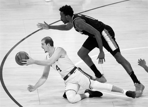 4月9日,湖人队球员卡鲁索(左)与开拓者队球员阿米奴在比赛中拼抢。