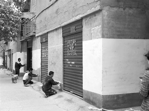 日前,我市正在开展户外广告专项整治行动,在荷花北路与丁字街交叉口路西,以前花花绿绿的墙体被粉刷一新。图为川汇区荷花路办事处安排人员铲除小广告、粉刷墙壁。 记者 张鲁莎 摄