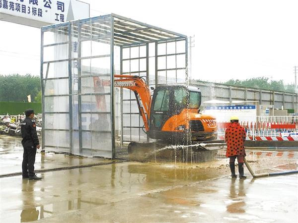 4月27日上午,川汇区一工地大门口,准备驶出工地的工程车正接受清洗。工作人员说,每辆工程车都有规定的清洗时间,一般是两分多钟,保证从工地出去的车辆干干净净。记者 王凯 摄