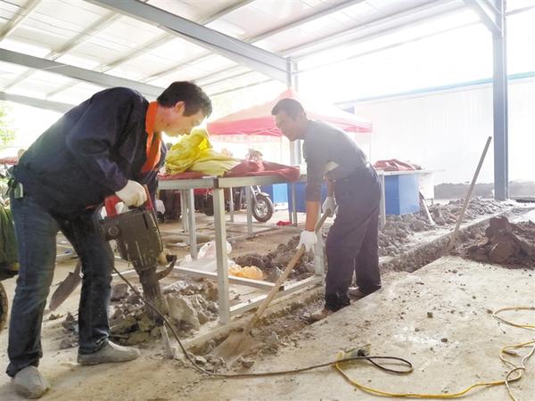 4月29日上午,在周口市中心城区文昌大道复兴社区便民服务点,工作人员正在改造下水道。为提升城市品位和整体形象,全面推动国家卫生城市创建工作,4月中旬开始,我市对中心城区现有的农贸市场和便民服务点进行专项整治,目前整治工作正有序进行。记者 窦娜 摄