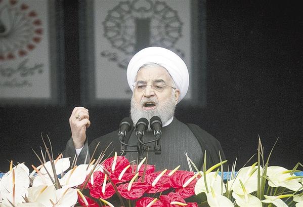 这是2月11日在伊朗德黑兰拍摄的伊朗总统鲁哈尼在伊朗伊斯兰革命胜利40周年纪念活动上发表讲话的资料照片。