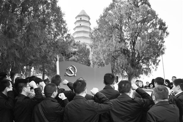 游客在陕西延安宝塔山上重温入党誓词(4月25日摄)。