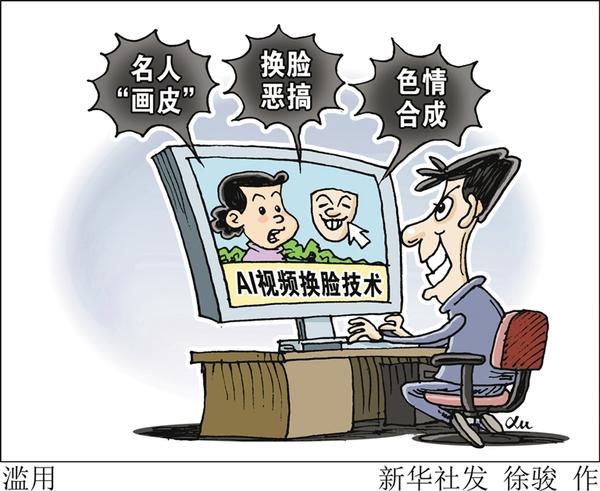 随着AI技术发展,视频换脸技术门槛降低,普通人也能制作换脸视频。记者调查发现,这项技术被用于恶搞视频、色情视频合成上,其不良效应也引发了社会的关注和担忧:放任自流,任其“异化”,可能成为侵害他人合法权益和危害社会公共安全的工具。新华社发 徐骏 作