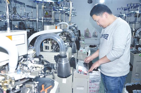 近年来,商水县谭庄镇出台优惠政策,为返乡创业人员在用地、资金、招工等方面提供全方位服务。目前,该镇已发展返乡企业20多家,产业涉及纺织、箱包、电子、玩具加工等领域,年产值1亿多元,带动当地2000多名村民就业。图为该镇三里村欧帅袜业生产车间一角。