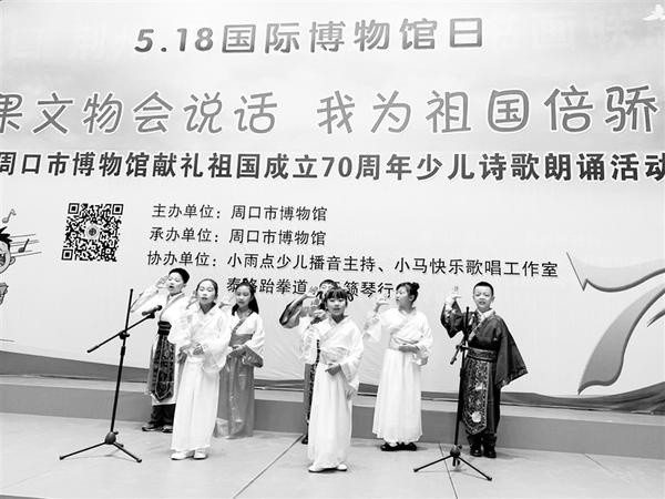 在少儿诗歌朗诵活动现场,小朋友们带来了别具一格的节目:有根据市博物馆的文物创作的诗歌作品《文物会说话:汉代玉猪》《文物会说话:战国青龙玉佩》,有集体朗诵《中华颂》《初升的太阳》《我骄傲我是中国人》,还有独唱、舞蹈、相声、跆拳道、非洲鼓表演等为活动添彩。