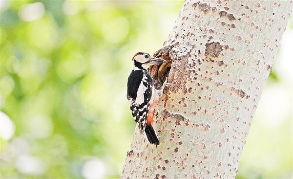 5月22日,在沈阳市浑河岸边的树林里,一只大斑啄木鸟觅食后回到树洞,准备喂养雏鸟。新华社记者 杨青 摄