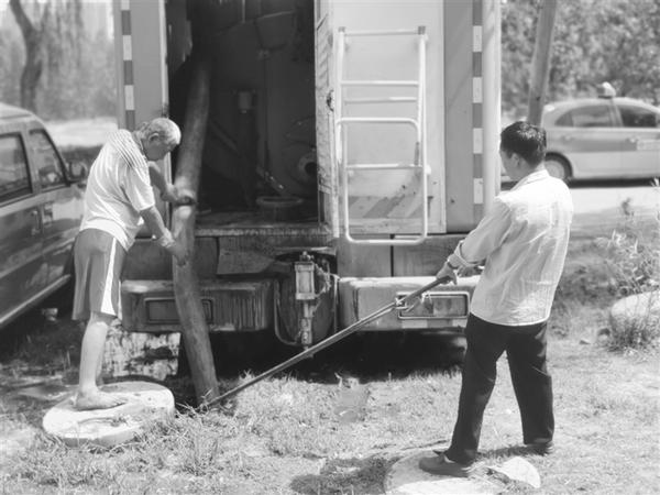 半小时后,车辆到达现场,开始清理化粪池。工作人员打开车辆后门拉出一根黑色管子,然后拉开化粪池盖,把管子插到池中。很快,在机器轰鸣声中,粪液污水被抽取到车辆的存储容器内。“处理粪液的车辆一次能抽取8立方米粪液污水,要抽3次才能把化粪池抽干净。”该负责人介绍。