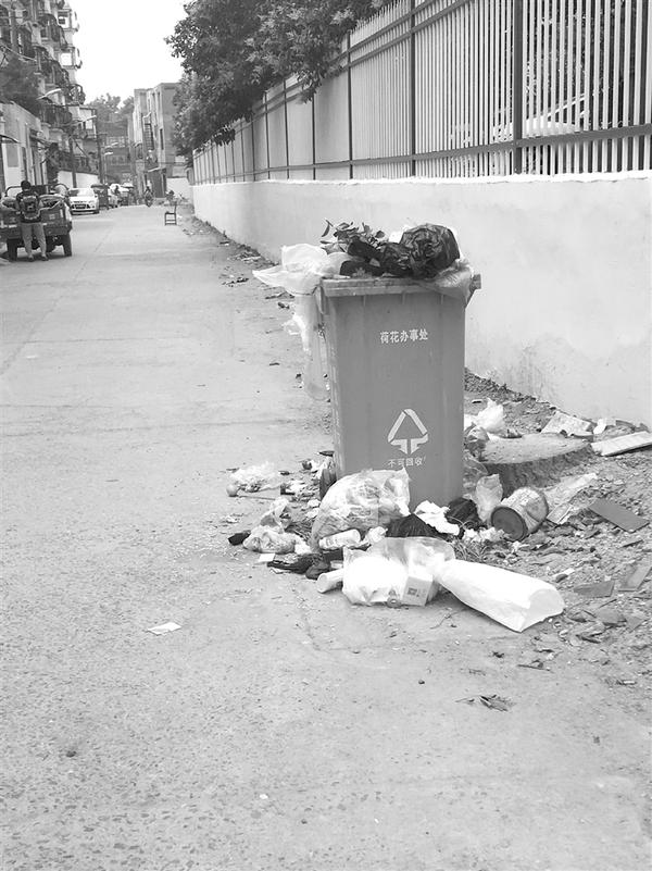 本报讯 6月3日11时许,记者来到中心城区丁字街,对5月31日本报3版以《垃圾桶不能“靠边站”》为题报道的垃圾随意倾倒现象进行采访,发现该街道摆放的垃圾桶装满垃圾,居民把生活垃圾倒在垃圾桶外(如图),严重影响市容环境。