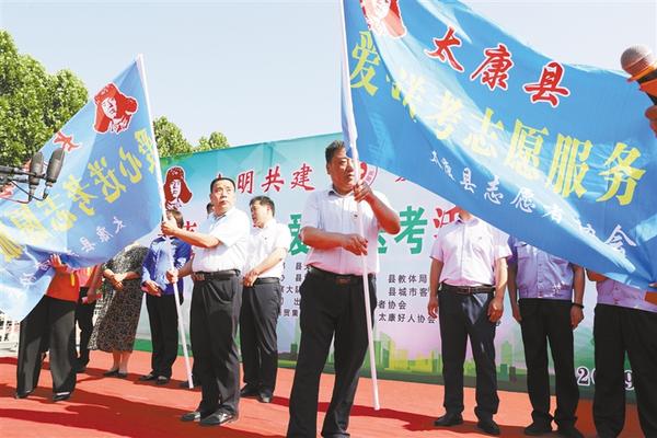 6月4日,由太康县委宣传部、县文明办主办,县委网信办、县城管局、县教体局等单位承办的“文明共建 爱心送考”公益活动启动,1000多名爱心志愿者和500多位爱心车主积极参加。图为志愿者代表接收2019爱心送考志愿服务队旗。记者 马治卫 摄