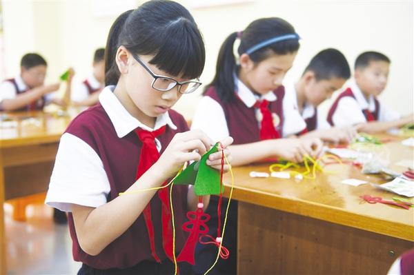 6月4日,洲泉镇洲泉实验小学的学生们在端午民俗课上学习香袋的制作。