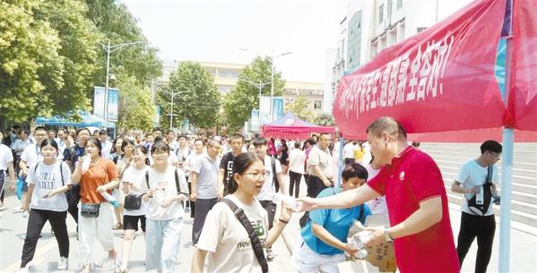6月7日上午接近12时,考生从考点蜂拥而出,一位考生接过瓶装水深有感触地说:“下了考场就收到爱心企业的瓶装水,缓解了我紧张的情绪,感谢社会各界对考生的重视和关心。”