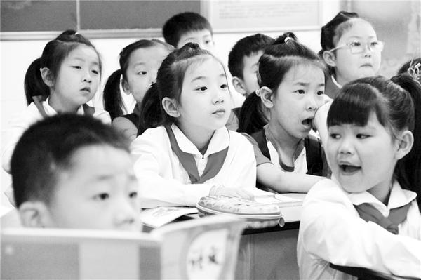 6月17日,幼儿园的小朋友和哥哥姐姐们一起聆听老师讲课。