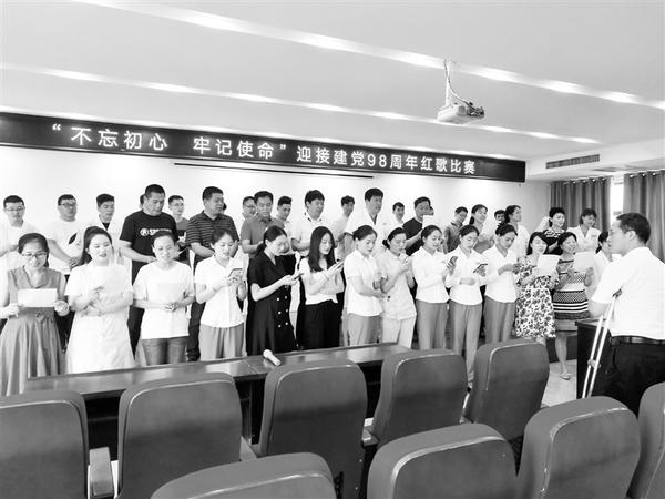 随着建党98周年纪念日的临近,我市各单位纷纷行动起来,开展各种形式的庆祝活动。民营机构党组织也激情满怀、不甘落后,周口协和骨科医院党支部积极组织开展“不忘初心、牢记使命”庆祝建党98周年红歌赛。据了解,该院党支部以“党旗引路、红歌育人”为初衷主动开展的这项为党庆生活动深受职工“追捧”,各科室、部门迅速组成10支参赛队,每天下午下班后,医院各个排练场里都热情满溢、歌声嘹亮。图为排练现场。