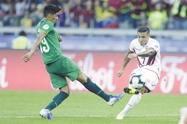 6月22日,委内瑞拉队球员马奇斯(右)射门得分。 当日,在巴西贝洛奥里藏特市举行的2019美洲杯A组第三轮比赛中,委内瑞拉队以3比1战胜玻利维亚队。 新华社发(卢西奥·塔沃拉 摄)