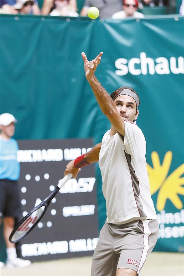 6月22日,费德勒在比赛中发球。当日,在德国哈雷网球公开赛男单半决赛中,瑞士选手费德勒以2比0战胜法国选手埃贝尔,晋级决赛。 新华社发(约阿希姆·毕瓦勒兹 摄)