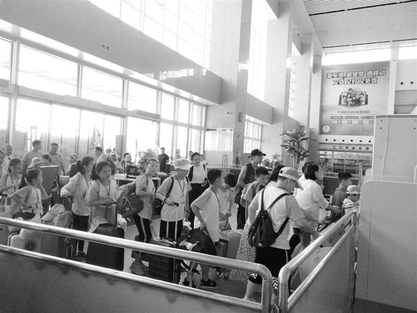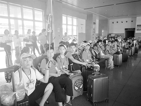 帽,参加研学夏令营的小记者提着各自的行李箱,排着整齐的队伍,等待启程。