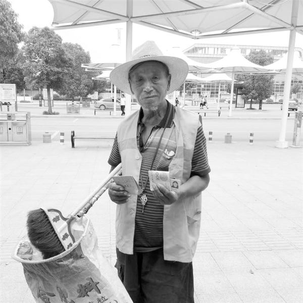 6月24日上午,开发区环卫工人田立学在新火车站广场打扫卫生时,捡到一个装有1400元现金、银行卡和身份证的信封。田立学上报领导后,在原地等待失主(如图)。