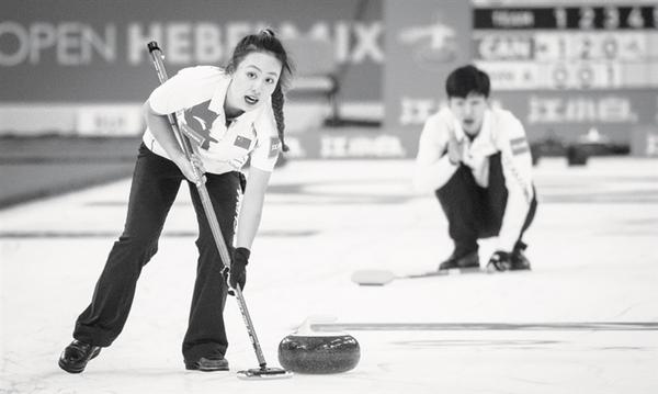 当日,在正定河北奥林匹克体育中心举行的中国河北国际混合双人冰壶公开赛比赛中,中国A队选手曹畅/苑明杰以3∶11不敌加拿大队选手彼得曼/加伦特。新华社发