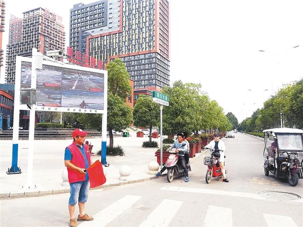昨天,在中心城区周口大道与庆丰路交叉口,一种新型交通设备正在提醒过往市民安全通过路口。据了解,新设备有语音提醒和自动抓拍行人闯红灯行为等功能。