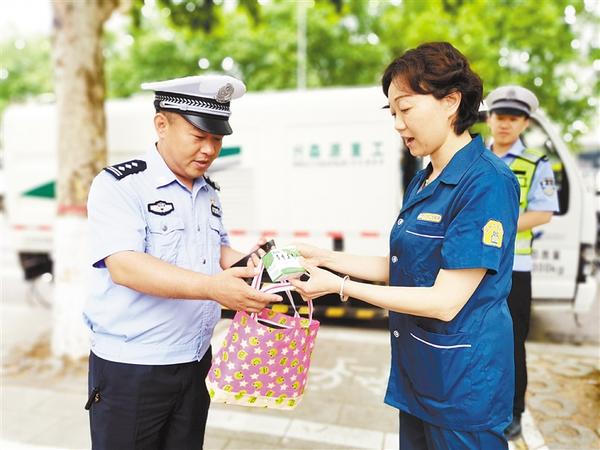 7月4日,川汇区陈州社区公共服务中心的工作人员走上街头,给奋战在“创卫”一线的交警、志愿者、环卫工人送去装着清凉油、藿香正气水等物品的“清凉”大礼包。