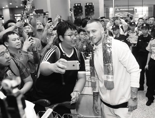 7月10日,奥地利籍球员阿瑙托维奇(右)在上海浦东国际机场与球迷互动。