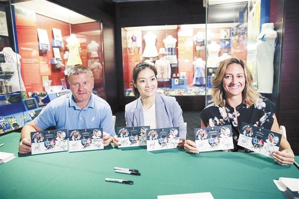 7月20日,本次入选名人堂的李娜(中)、卡费尔尼科夫(左)和皮尔斯在国际网球名人堂向记者展示他们的签名卡。 当日,国际网球名人堂入选仪式在位于美国罗德岛的名人堂总部举行。中国选手李娜、法国选手皮尔斯和俄罗斯选手卡费尔尼科夫正式进入国际网球名人堂。 新华社记者 王迎 摄