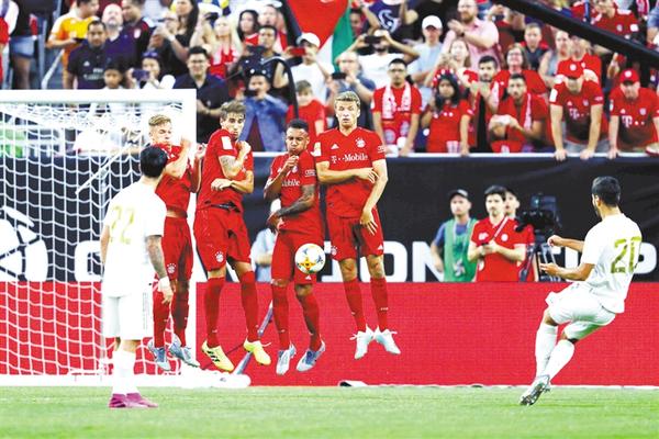 7月20日,拜仁慕尼黑队球员排起人墙阻挡皇家马德里队球员阿森西奥(右一)的射门。 当日,在美国休斯敦举行的国际冠军杯赛比赛中,德甲拜仁慕尼黑队以3比1战胜西甲皇家马德里队。 新华社/法新