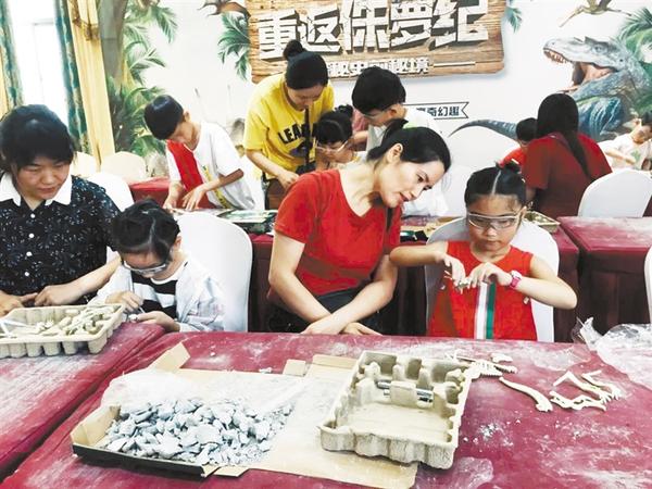 7月22日上午,记者在汇林·绿洲销售中心看到,许多小朋友带着护目镜、口罩,手中拿着各种考古工具,在工作人员的指导下进行着“恐龙化石”考古挖掘游戏,场面显得温馨而庄重。