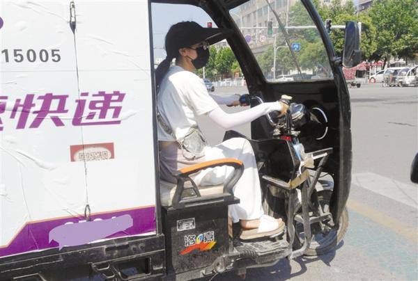一名美女快递员在八一大道与黄河路交叉口等待红绿灯。