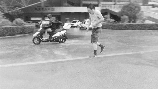 周口市体育中心内,一位市民在狂风暴雨中奔跑。昨日下午4时许,大风夹杂着暴雨突袭我市,中心城区雷电交加、大雨倾盆,持续多日的高温天气有望得到缓解。 记者 关秋丽 摄