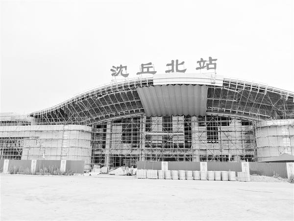 根据项目建设方提供的数据,沈丘北站建设进度相对较快,已完成90%的建设任务。记者在沈丘北站看到,站房外立面脚手架基本拆除,站房轮廓十分清晰。站房内部地面正在铺设中,吊顶已施工过半。
