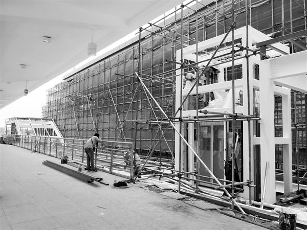 站台旁边的车站站房正在装修中,配套设施也正在加紧施工。据工作人员介绍,站房外立面装修正在按计划推进,内部装修同步进行。在站房内记者看到,脚手架、装修材料有序摆放,工人正在忙碌。在站房西侧,天桥、广场、地下车库等也正在加紧施工。