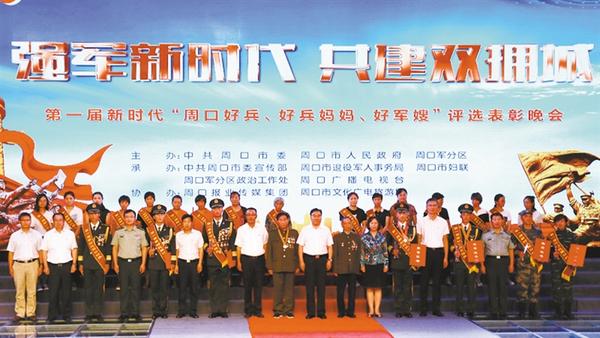 本报讯 为进一步增强广大周口籍官兵爱军精武、建功军营的荣誉感、使命感,弘扬新时代好军嫂、兵妈妈的奉献精神和传统美德,在全社会营造“军爱民、民拥军”的良好氛围,7月30日晚,由市委、市政府、周口军分区联合举办的周口市第一届新时代“周口好兵”“好兵妈妈”“好军嫂”评选表彰晚会在周口广播电视台演播大厅举行。