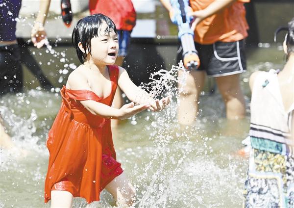 8月7日,小朋友在海南保亭七仙广场上嬉水。