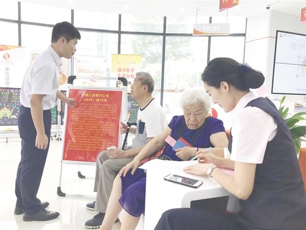 为让广大群众更好地了解2019年版新版人民币,增强反假币意识,近日,郑州银行周口分行通过在营业厅摆放展板、现场讲解和LED大屏滚动播放等形式,对前来办理业务的群众广泛开展宣传。图为8月26日,该行员工在向储户耐心讲解2019年版第五套人民币票面特征及识别假币方法。 记者 徐如景 通讯员 张冉 摄