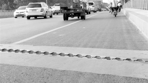 周口市中心城区沙颍河周口大道桥一处桥面钢板衔接错位,“张口”吓人。昨日,记者在该桥东侧桥面上看到,有两段上下咬合、用来衔接桥板缝隙的钢板明显错位,形成不同程度的开口,最大开口约5厘米宽,加之上下两条钢板都有“牙齿”,很是吓人。车辆和行人路经此处时,大都绕道而行。希望有关部门尽快修复此处桥面,及早消除安全隐患。记者 王辛泉 摄