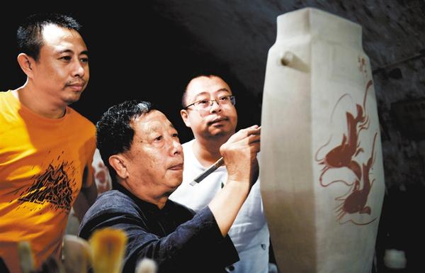 9月12日,在河北邯郸市峰峰矿区磁州窑盐店遗址博物馆制作工坊,刘立忠(中)指导大儿子刘鹏润(左)和二儿子刘鹏举在坯体上彩绘。