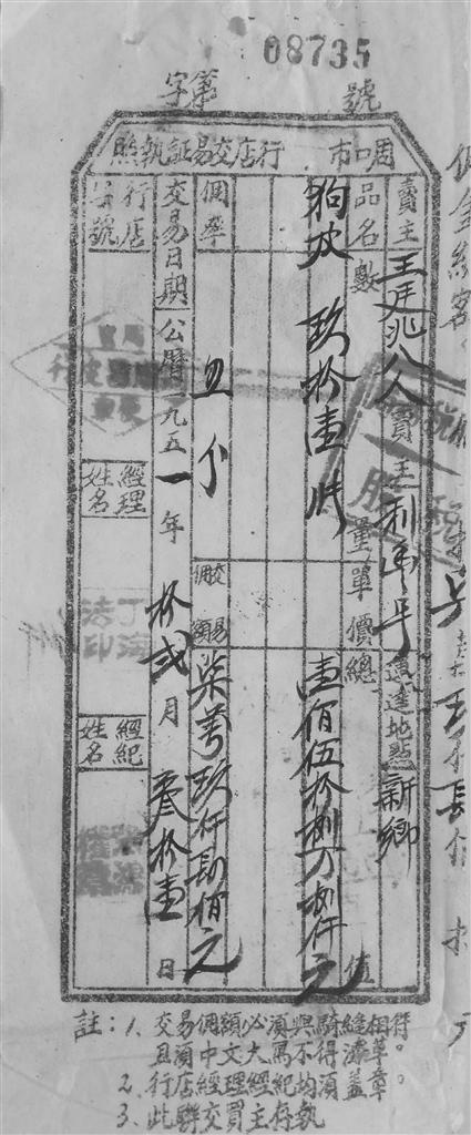 笔者在山西省运城市发现了12张建国初期的“周口市行店交易证执照”,记载外地商号来南皮都——周口采购皮张的情况。交易品名记录为“狗皮”或“犬皮”,交易时间主要集中在1951年12月下旬,交易数量共计12单321张狗皮。交易金额以旧币计,单位是万元(到1955年3月1日中国人民银行开始发行第二套人民币,新币与旧币的兑换比率为1:10000),12单总交易额为559.65万元。交易佣额皆按佣率5%计算,12单总佣额为27.983万元。行店字号有大兴、同顺昌、马丰顺、盛丰行、天兴祥、祥泰、协和、义盛福共8家。经理姓名一栏有4张印有丁海法印,2张印有李颍芝章,印有丁树芳章、蒋国祥章、赵□□□、马□□□、马□□章各1张,1张未印经理印鉴。经纪姓名一栏有4张印有张鸿权章,印有马廷冻章、□□仲印、马□□章各1张,其余未加盖经纪人印鉴。皮张卖主是李传进、王应明、刘官荣、马良才等人,买主均是“利丰号”,运达地点1张记载的是北京,2张是新乡,另外9张未填写。交易证背面贴有1枚至11枚不等印刷于1949年的印花税票,票额有10元、20元、50元、100元、200元、500元、1000元、2000元、5000元9种。印花税票上有的印有“印花税讫”长方形印鉴,有的印有行店字号的印鉴,有的二者兼有。有4张交易证背面印有圆形蓝色印鉴“平原省新乡市税务局车站税务所”,其余8张未加印。