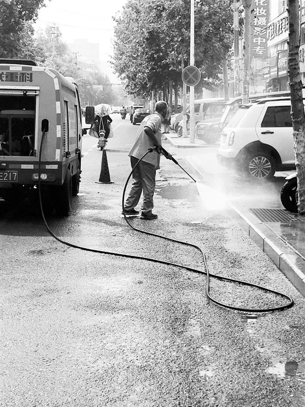 9月25日上午,川汇区环卫工人在五一路上用高压水枪冲洗路面油污。由于五一路饭店较多,产生的油腻污水附着在路面上,时间久了就形成一层油污,普通清扫工具无法彻底清除,只能用高压水枪进行冲洗。