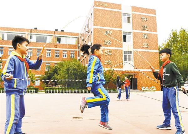 10月15日,在新乡市新区小学操场上,学生在练习跳绳。